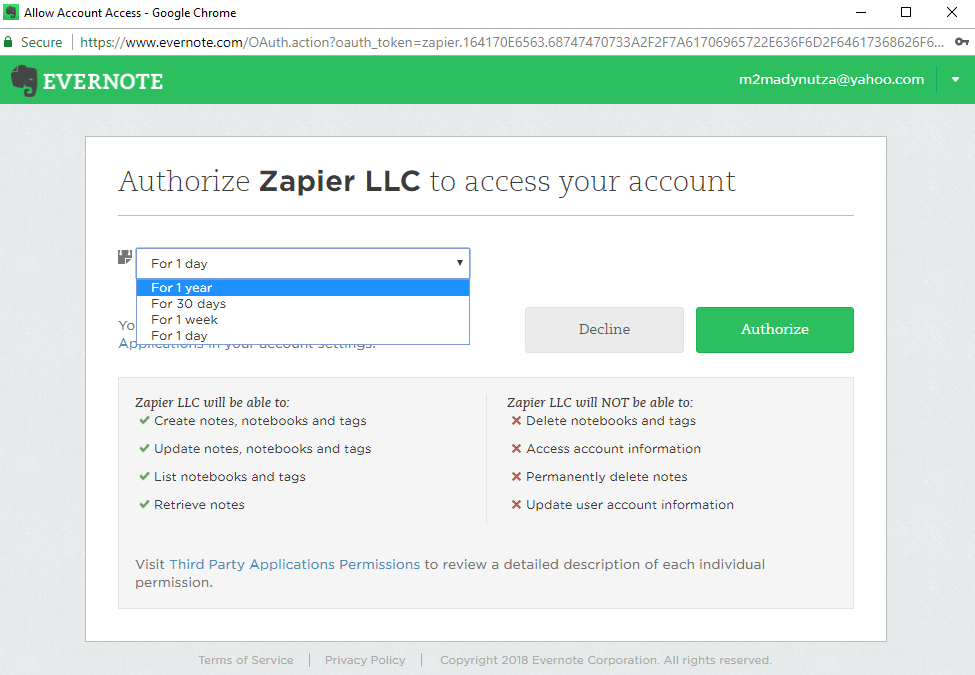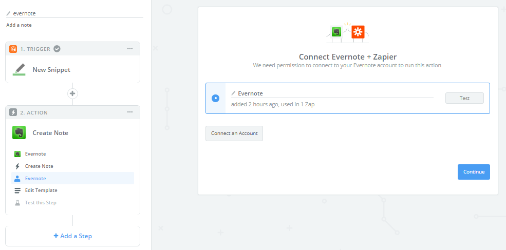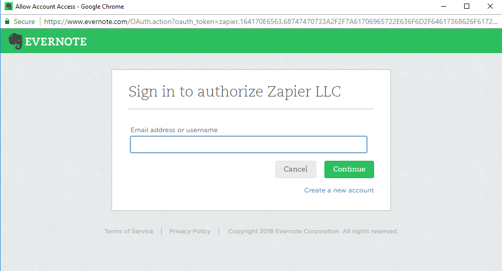 9. In order for Zapier to be able to send all the information to Evernote, you will be requested to connect to your Evernote account.